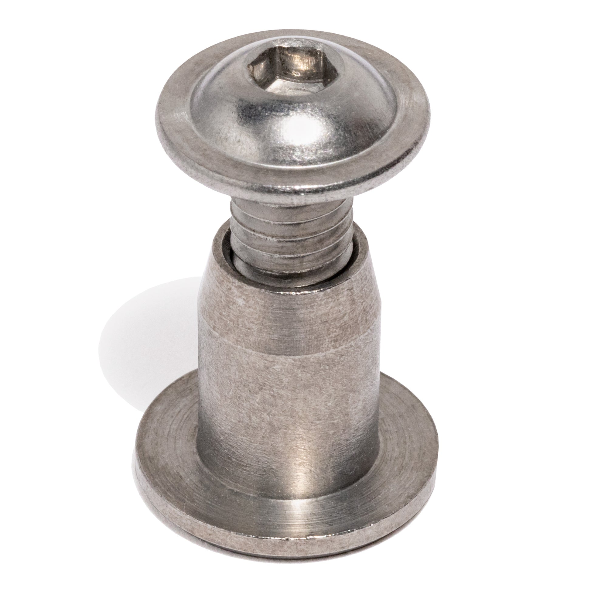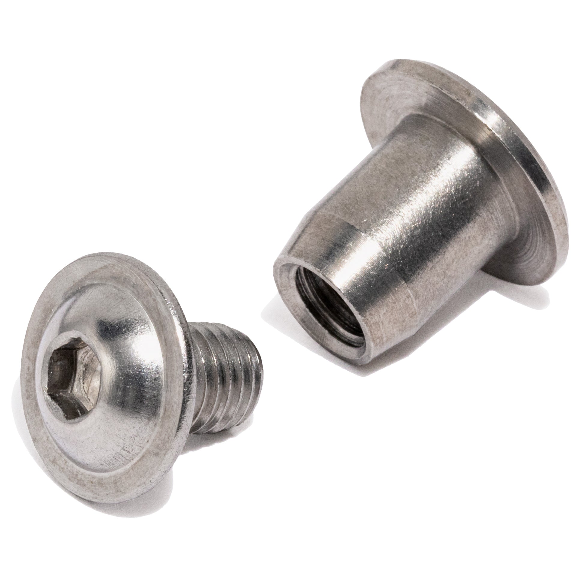 Das Set besteht aus einer Hülsenmutter Flachkopf Edelstahl M 8 x 15 mm und einer Linsenflanschschrauben M8 x 12 jeweils aus Edelstahl.